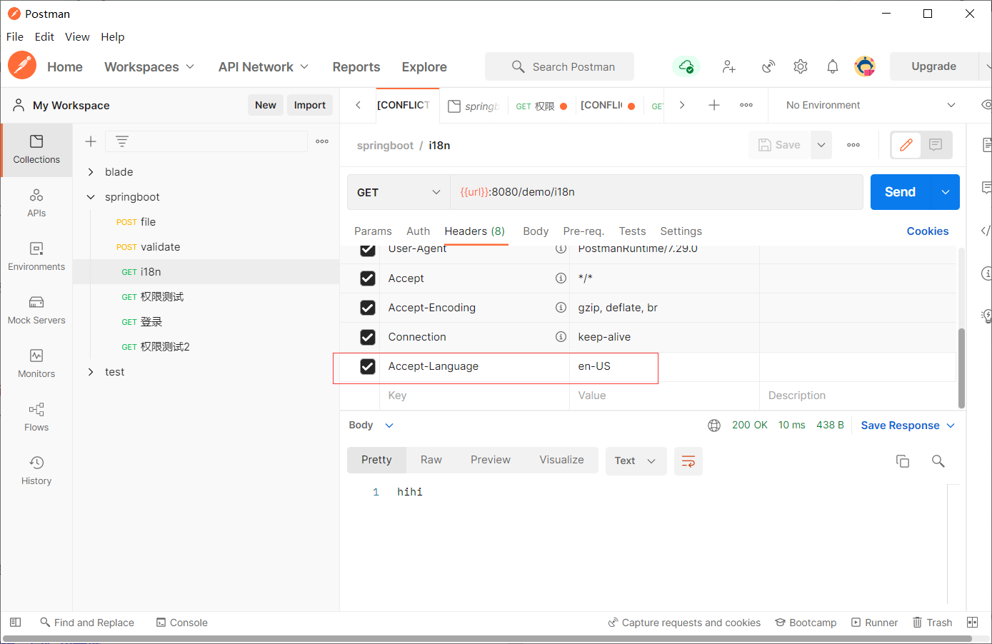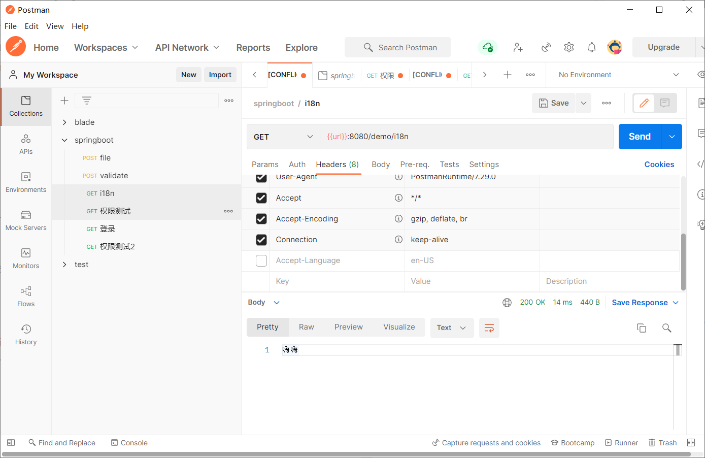 @GetMapping("i18n") public String i18nTest(){ return messageSource.getMessage("test",null, LocaleContextHolder.getLocale()); } }